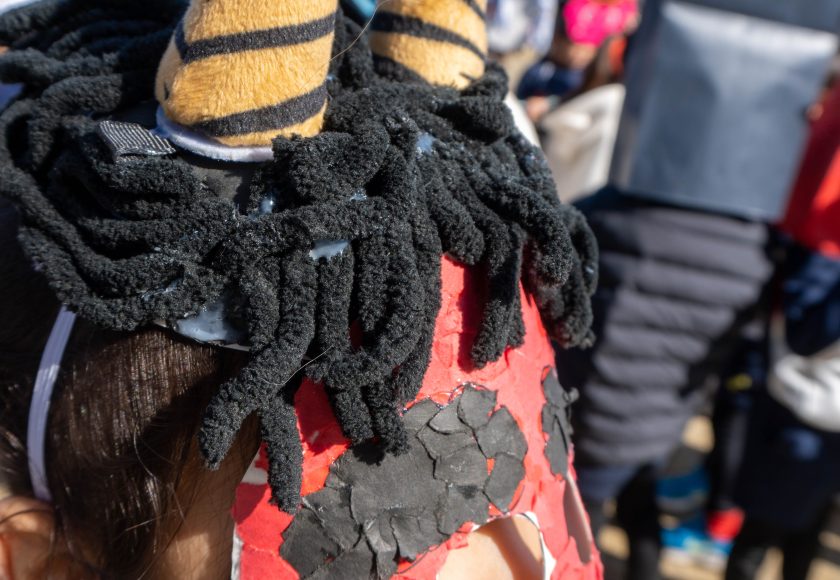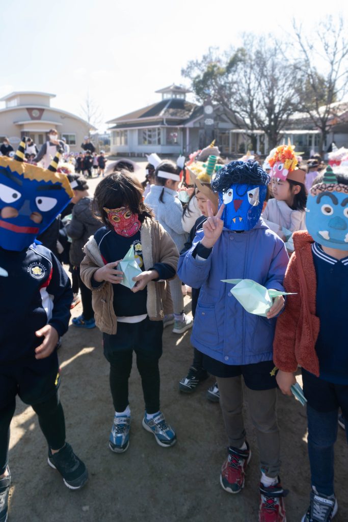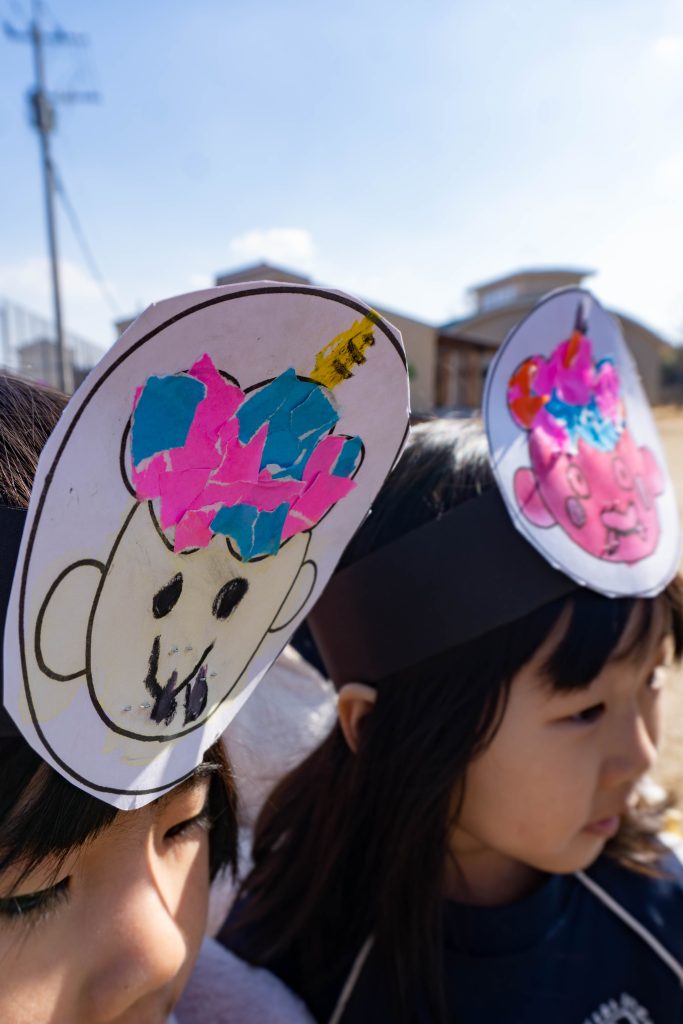 園庭に集まった子どもたちの頭にはユニークなお面がキラリ