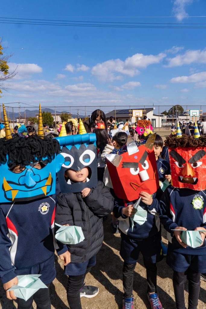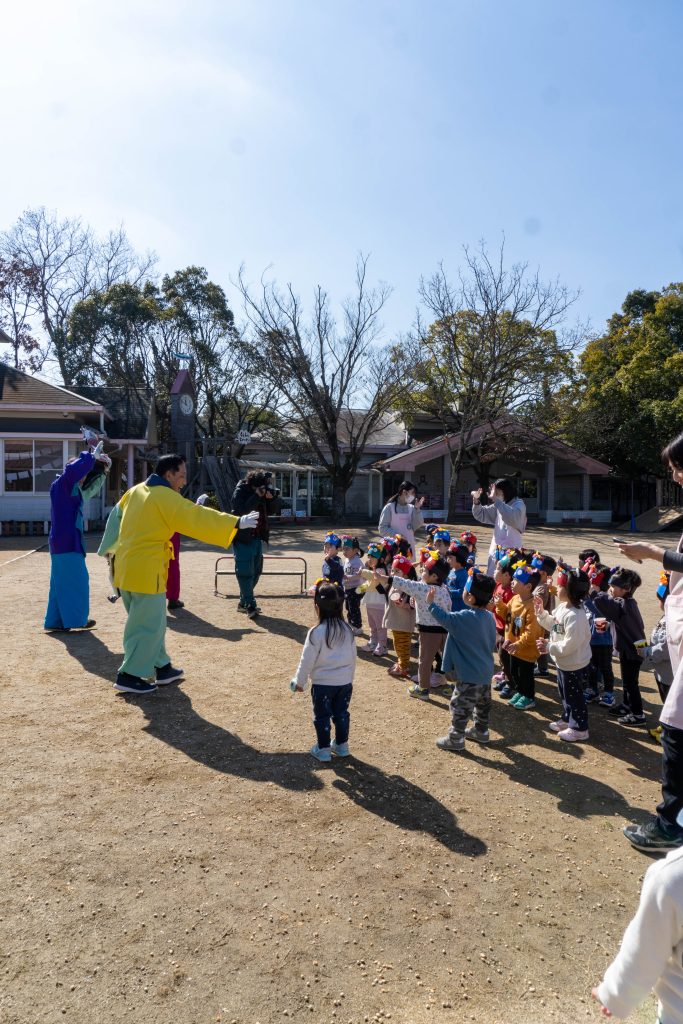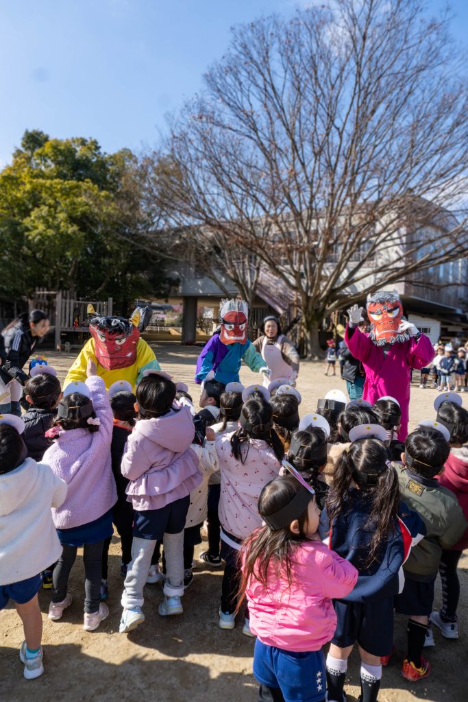 「おにーは外!ふくーは内!」 元気いっぱいの掛け声とともに一生懸命に豆を投げる子どもたち