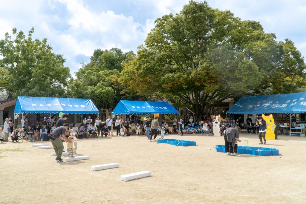 その他にも親子で一本橋を渡って魚釣りをし釣った魚を猫の口に入れる競技もありました