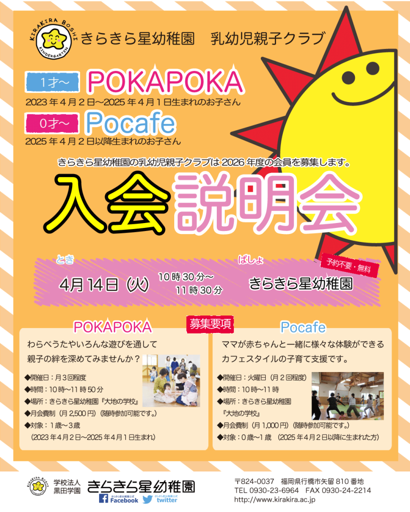 きらきら星幼稚園では2026年度乳幼児親子クラブ『POKAPOKA』及び『Pocafe』の説明会を行います