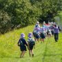 スタートライン付近では次の走者の子どもたちが腕を伸ばして待っています。