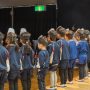 きらきら星幼稚園の2歳児、年少、年中、年長クラスと小さな星の保育園の子どもたちが、避難放送を聞いて一斉に運動場へ避難しました。