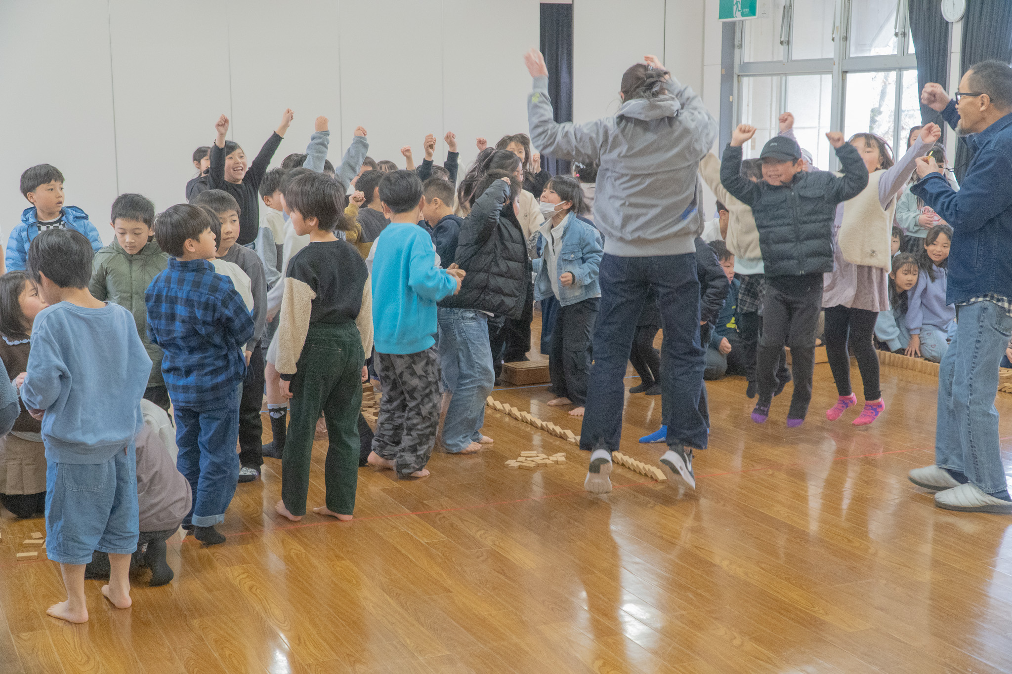 大成功!ジャンプして喜ぶ子どもたちに、先生たち大拍手。