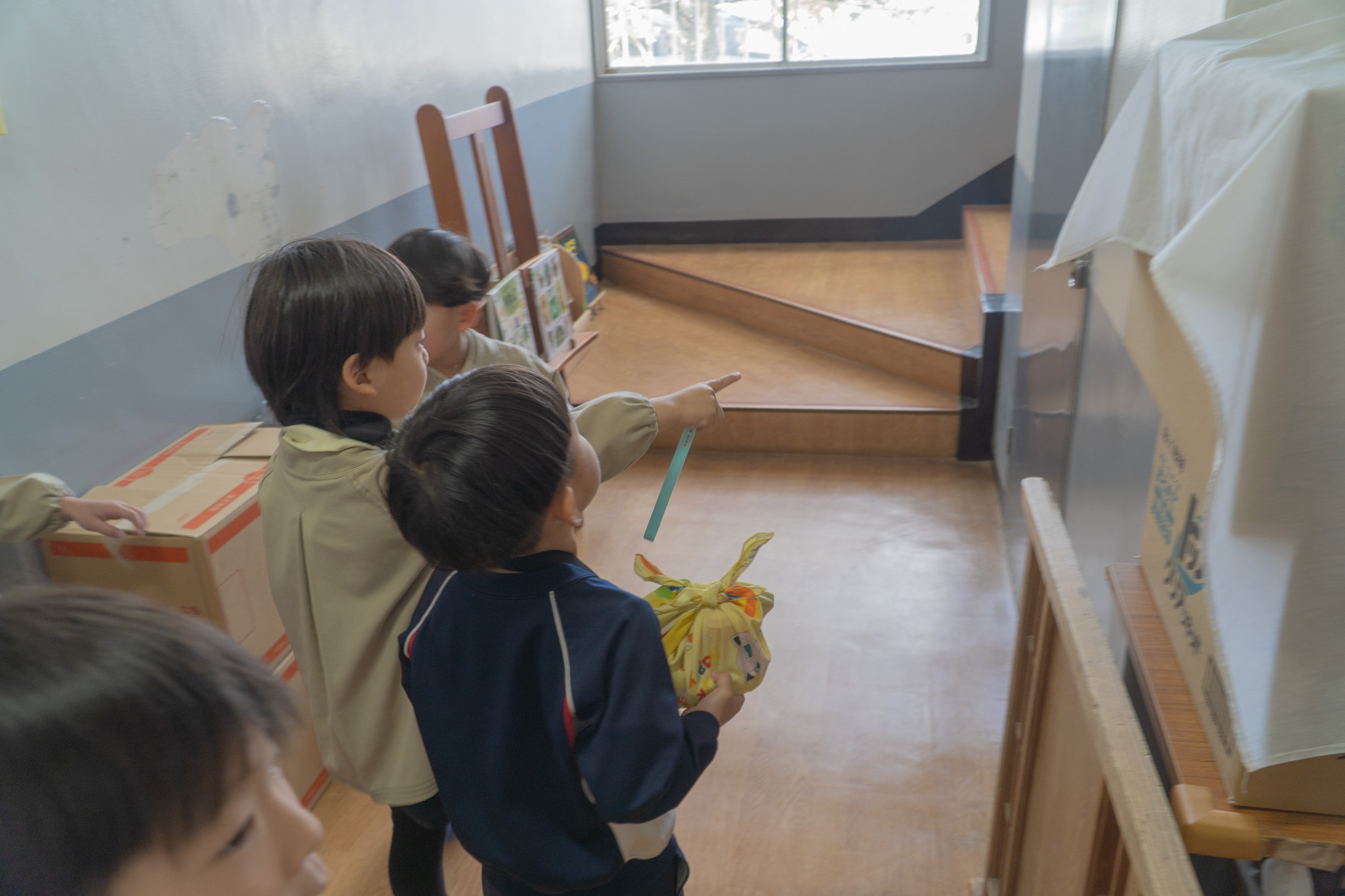 年長さんは、園長先生とのお食事会の会場「ひみつの部屋」を探しに出発しました。